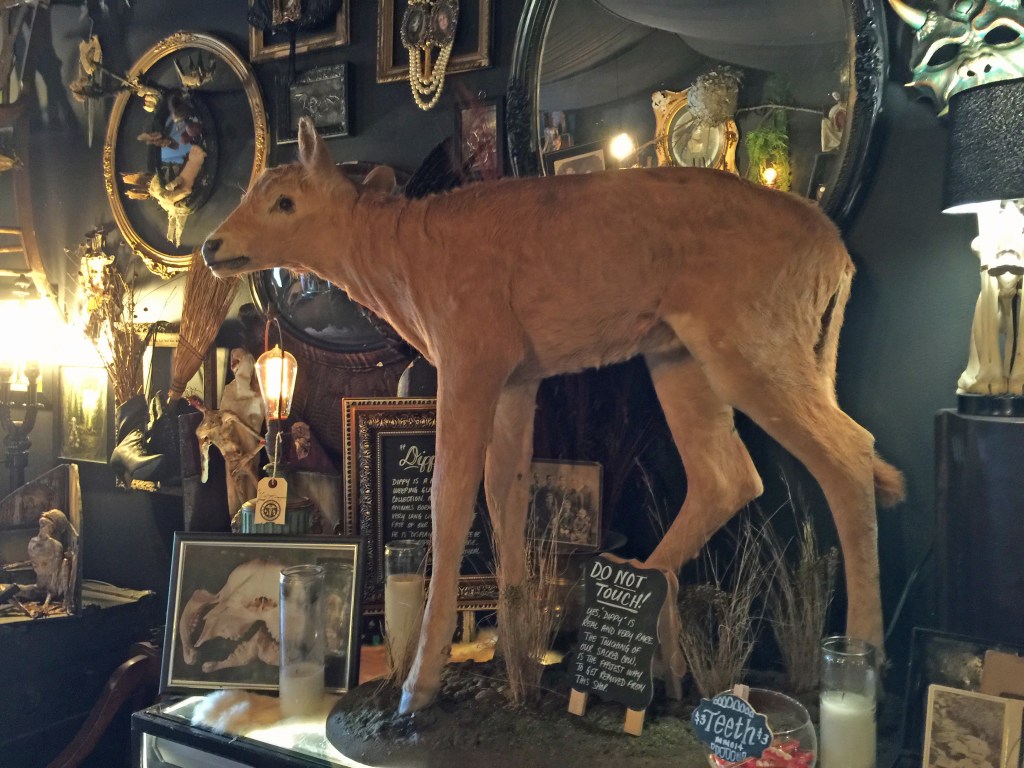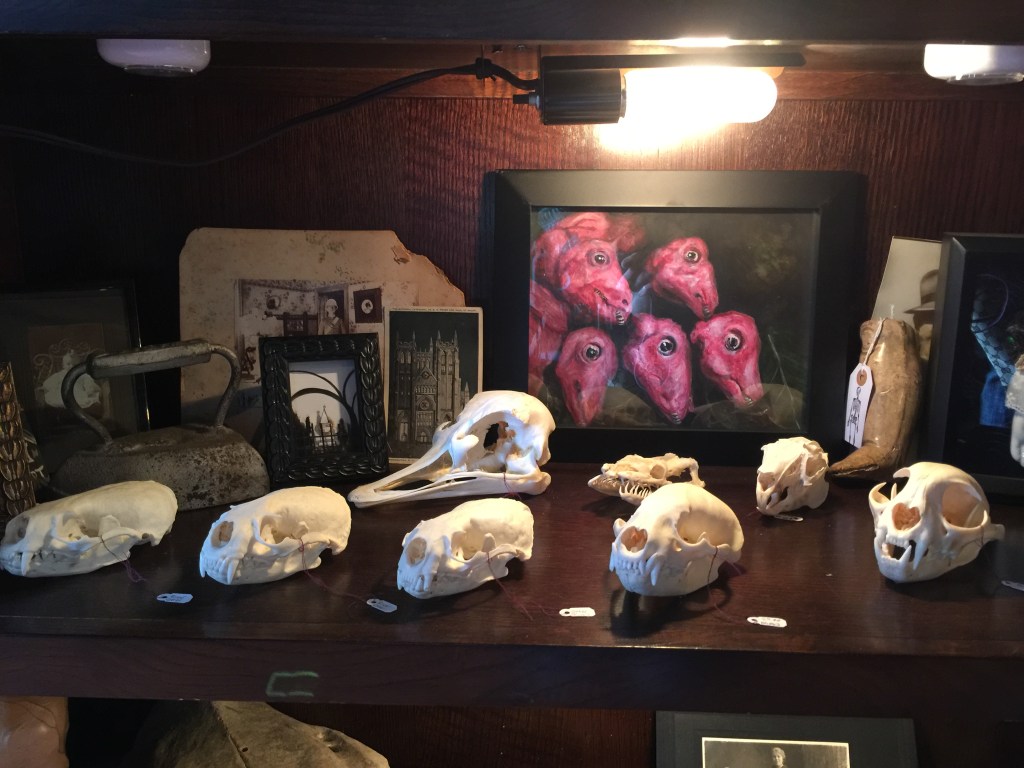Kelly Macabre Noir and Aaron Doctor, also known as Dr. Morose, created the annual traveling sideshow Morose and Macabre’s Atrocity Exhibition featuring a “cavalcade of the beautiful and grotesque, brought to life by a cabaret of bizarre entertainers, artists, and artisans.” It is only fitting that they opened a shop to house these creations. Various altars are situated throughout the compact store. Private collectors display taxidermied animals in small vignettes.