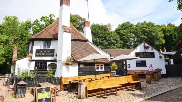 It was originally called The Round House. In 1756, the name changed to The Three Pigeons, with records verify with it operating as a public house. During the 1800, the name changed to The Fighting Cocks, as cock fighting was held on the premises.
