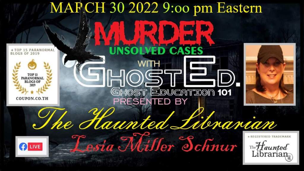 Murder: Unsolved Cases 29 Tuesday Mar 2022 Posted by The Haunted Librarian in Ghost Education 101, Unsolved Murders ≈ Comments Off on Murder: Unsolved Cases TagsGrimes Sisters, Hundley Brothers, Lawson Family, Sodder Children I’ll be presenting “Murder: Unsolved Cases” on Ghost Education 101 this Wednesday, March 30 at 9 pm EST. It will be live! Join us as we discuss some of America’s most heinous–and unsolved–crimes. Some have hauntings attached, too. Share this: Click to share on X (Opens in new window) X Click to share on Facebook (Opens in new window) Facebook Like Loading...