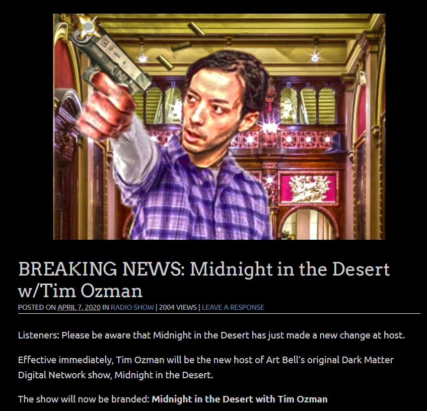 The show has gone through several hosts. Heather Wade initially hosted when Art left. Dave Schrader had a stronger run, May 2018-January 2020. He left to pursue new paranormal opportunities. Frequent fill-in host Tim Weisberg lasted less than 4 months. He and his producer, Michelle Freed, were released from their contracts last week. (Note: Tim has fast-tracked his new Internet radio show, The Midnight Society, which debuted Monday, April 6th. Listen nightly at www.midnight.fm) Heather returned for a couple of days but was released from her duties on April 8th when the show announced Tim Ozman, a noted conspiracy theorist who believes the earth is flat, as the new host.