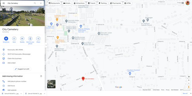 Having possibly solved this conundrum only yielded a new one. Looking at the map of Kosciusko, the city cemetery is a ways—a long ways—away from Jefferson Street. If Clay was on the third floor, looking south, he would still need binoculars to see the monument. I’m not dismissing the heartbreak he felt and the story. I’m questioning the ability of Clay to see the statue. Maybe that area of Mississippi was clear-cut without any trees. My guess is that this is an embellishment in an already tragic story.
