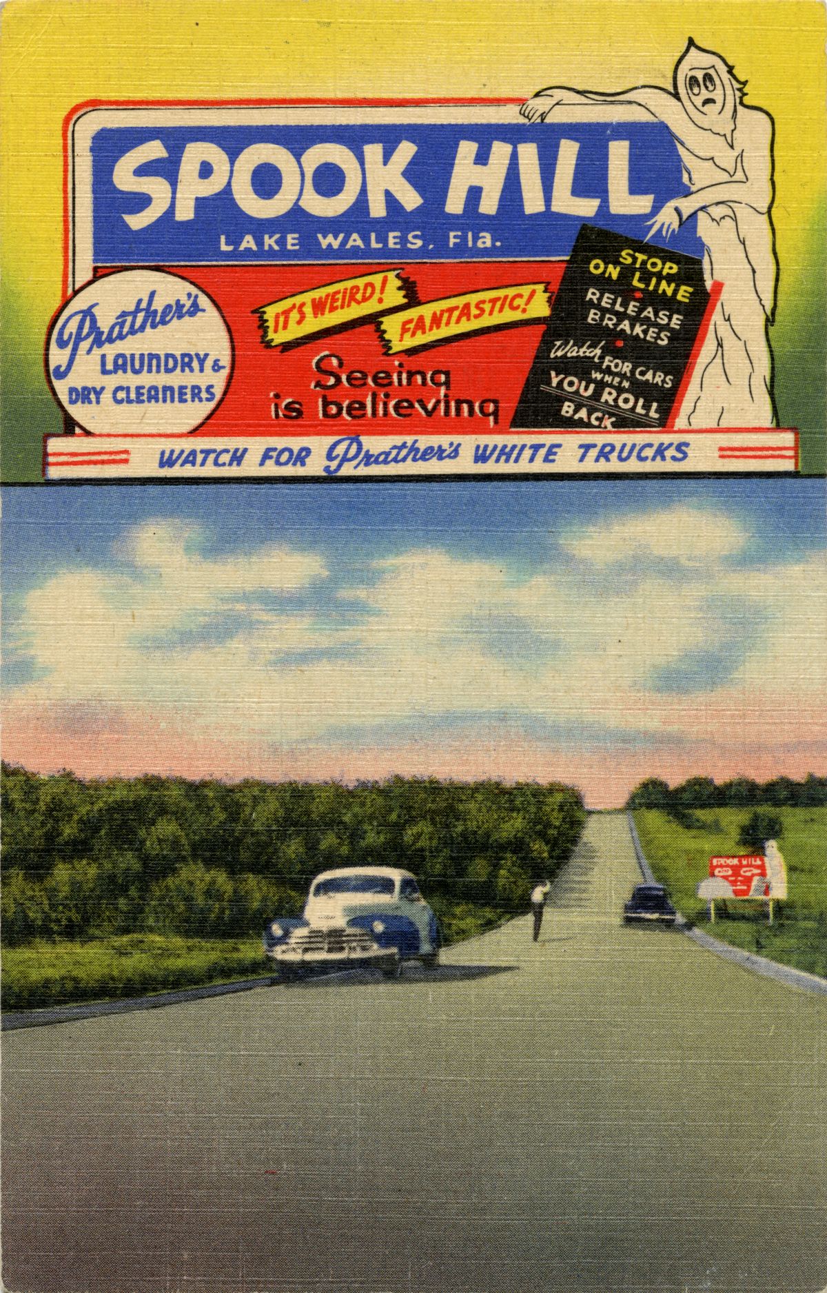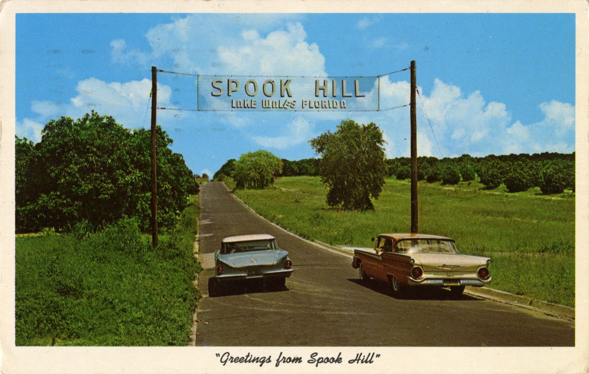 Spook Hill became a tourist attraction in the 1950s when Barney’s Restaurant in Lake Wales, Florida published a leaflet describing the “facts” associated with the gravity hill. A gravity hill is an optical illusion whereby someone places a car in neutral on an undetectable downhill slope and the vehicle rolls uphill. In reality, the vehicle is rolling downhill, but the occupants don’t realize this because they do not have a true horizon line to focus on. Instead, they feel like they are being pulled uphill. Gravity hills are also called magnetic hills, for some believe there is a magnetic pull causing the vehicle to move. Spook Hill is the only documented gravity hill in Florida, and early marketing agents quickly seized upon it.