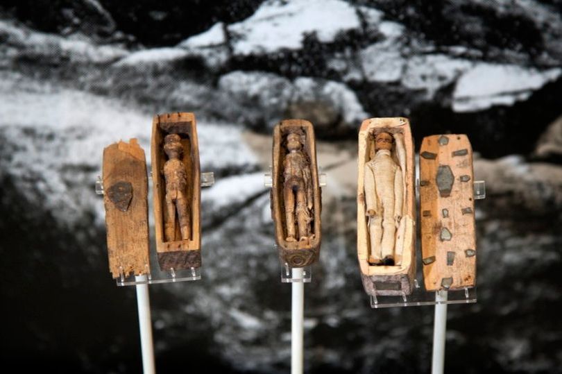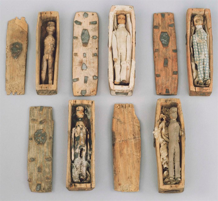 Measuring no more than 4 inches in length, the Scot pine wooden coffins held male figures wrapped in fabric. The tale states that there were 3 tiers of coffins, two with 8 and the top one with 1, in all. The boys collected the coffins and decided to play toss, destroying all but 8.