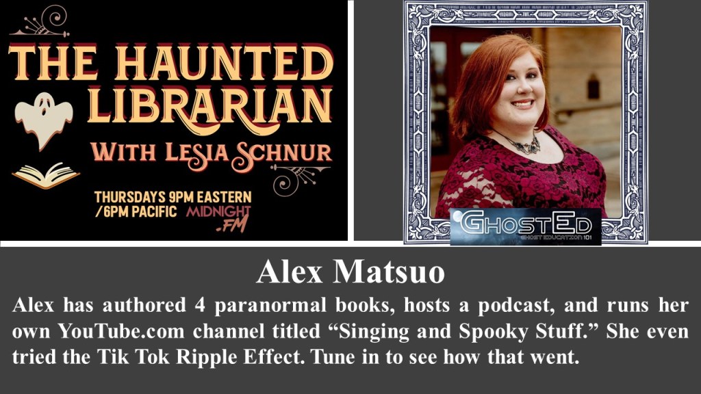 Podcasts and YouTube videos are incredibly popular, especially paranormal themed ones. Due to COVID, a lot of ghost investigations have been sidelined. Alex makes several suggestions on how to cope during the quarantine. In addition, author of 4 books on the paranormal, Alex proffers insight into paranormal investigations and other topics, shares some of her stories, and talks about joining Tik Tok and the Ripple Effect challenge on The Haunted Librarian Show.