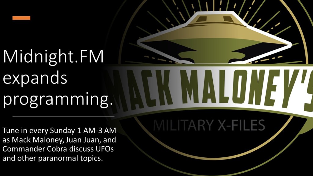 Mack Maloney hosts a weekly radio show. He is joined with co-hosts Juan Juan and Commander Cobra to discuss UFOs and other paranormal topics. Special guests add to the entertaining conversation. Mack Maloney’s Military X-Files has enjoyed dedicated audiences and has evolved into one of the Internet’s popular paranormal programs. The new paranormal station, Midnight.FM, has added the show to its programming line-up. Tune in and discover what others have found: Paranormal shows can be lighthearted AND educational.