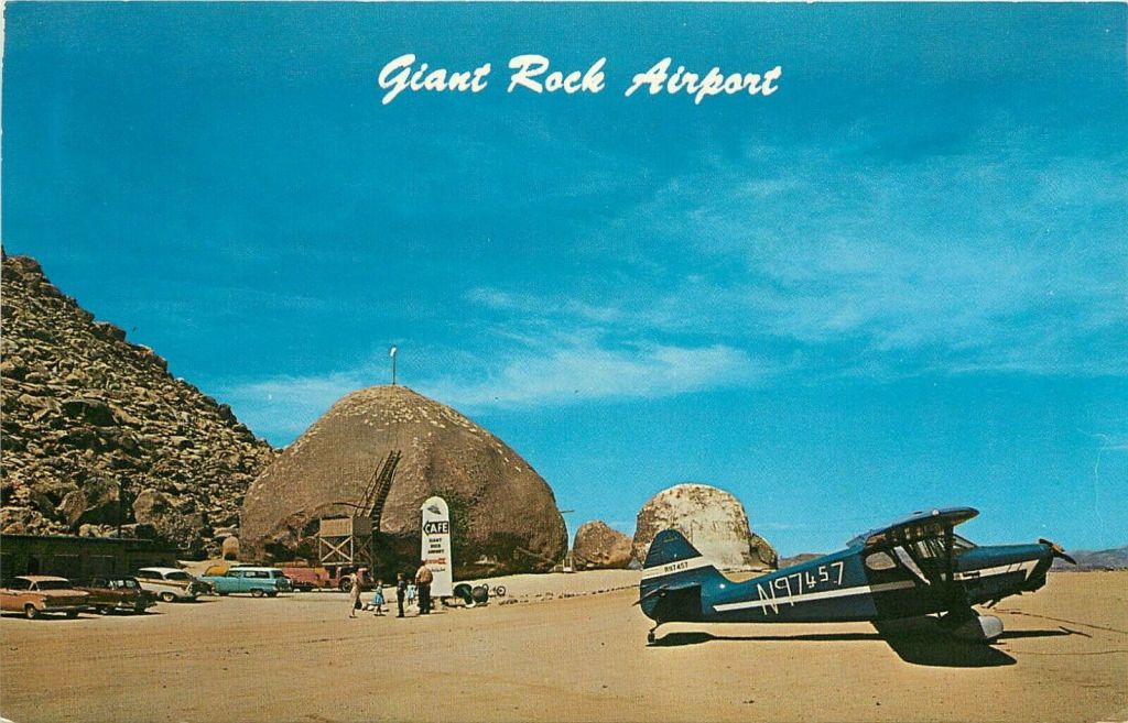 The Giant Rock is a massive natural rock structure in the Mojave Desert. German American Frank Kritzer squatted under the rock and made it his home. The hermit believed there were glass-lined tunnels underneath the rock and attempted to locate while managing an emergency airstrip, often called an airport. (Note: See forthcoming blog on him) After Kritzer was blown up and killed on July 25, 1942, George and family took up residency and began running the airport.