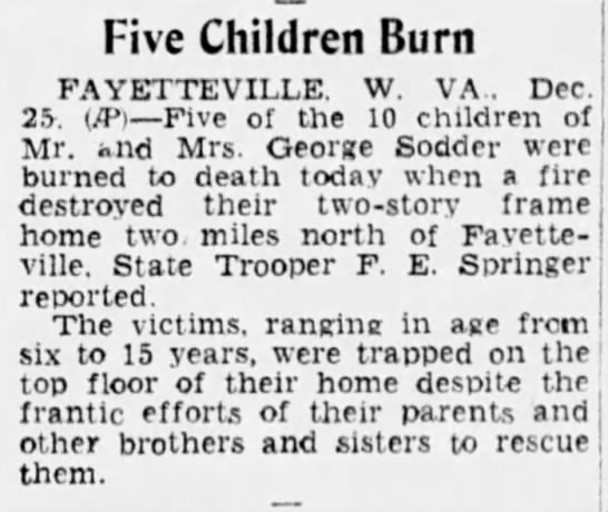 Giorgio “George” and Jennie Sodder emigrated separately from Italy but found love in Smithers, West Virginia. They had 10 children and built a better life by moving to Fayetteville, settling on Route 16. With their older son serving in the military, the family of 11 (9 kids plus George and Jennie) celebrated Christmas Eve by opening a few gifts and tucking in early. Five of the children slept upstairs in two rooms. The three older children fell asleep downstairs near the Christmas tree. George and Jennie retired to their bedroom with the 2-year-old toddler, Sylvia. Nothing seemed amiss until a fire broke out at 1 am.